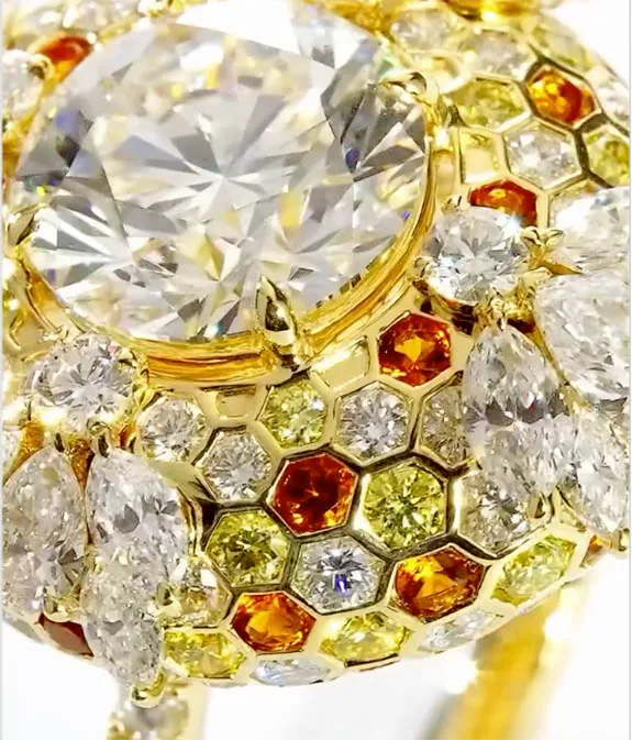 Set in 18-karat yellow gold, the ring features a brilliant 2.5-carat round white diamond, symbolizing unity and enduring love. Surrounding the center stone is a honeycomb-inspired design, intricately detailed with white and yellow diamonds, citrine accents, and diamond clusters that evoke the whimsical image of bees buzzing around a hive. The wide bezel setting adds a bold, modern touch while enhancing the ring’s beehive motif.